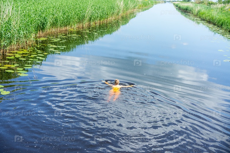 Девушка-купальщик в озере, девушка плывет по реке