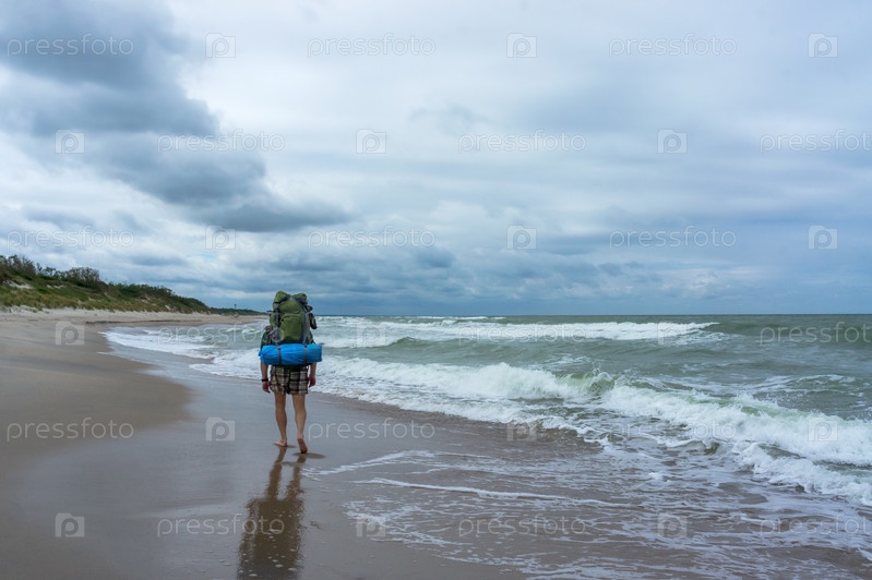 Мужчина с большим рюкзаком, турист гуляет по морскому побережью