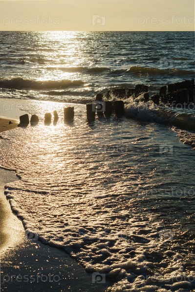 Закат над морем. Отражение солнечного света в морских волнах. Волнорез в море. Небо в лучах заката. Балтийское море