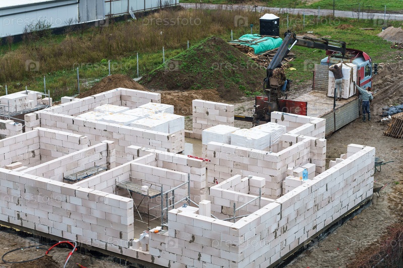 Строительство частного дома. Строительство на частной территории. Дом из белого кирпича