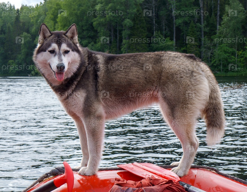 Хаски. Плот на реке. Красный плот и собака у реки