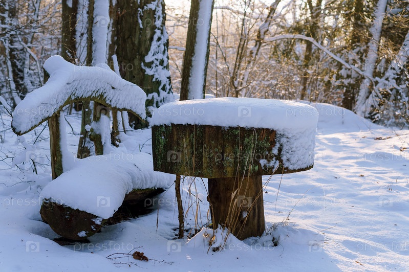 Скамейка в заснеженном лесу. Место в лесу для отдыха путешественников. Зимний пейзаж в лесу