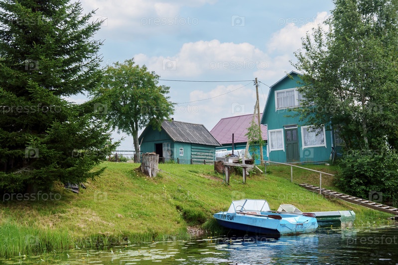 Дом и лодка на берегу реки. Аккуратная набережная реки. Частная территория возле реки