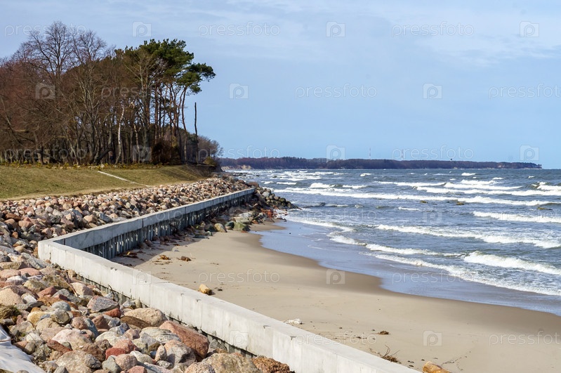 Береговые подкрепления на море. Волнорезы и волнорезы на берегу моря. Морская набережная защищена от штормов