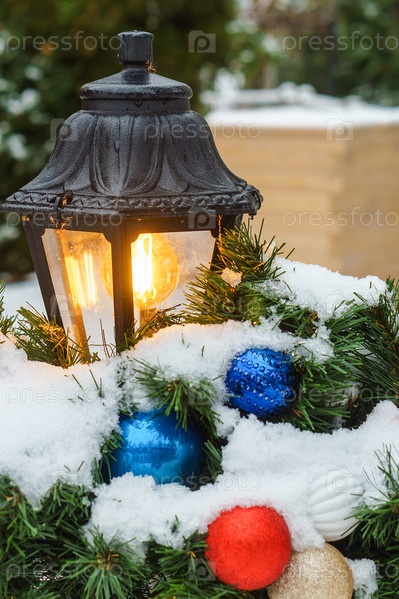 Декоративный фонарь с желтой лампочкой. Елочные игрушки и декоративный фонарь на улице. Украшаем город к Новому году