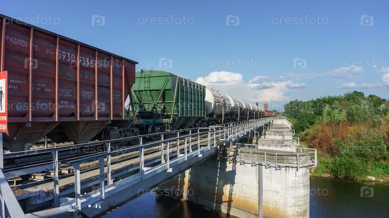 Вагоны товарного поезда на мосту. По мосту проезжает грузовой поезд