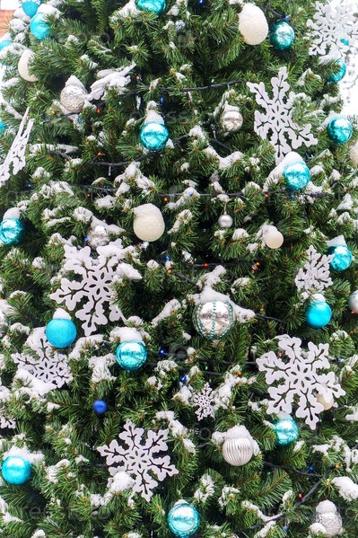 Новогодняя елка в городе. Бело-синие украшения на елке