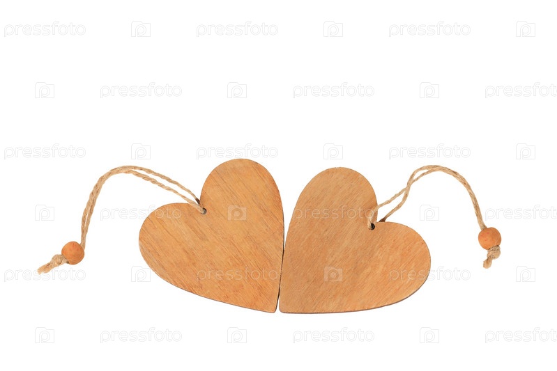 Два деревянных сердца лежат рядом, изолированные на белом фоне. Открытка ко Дню святого Валентина