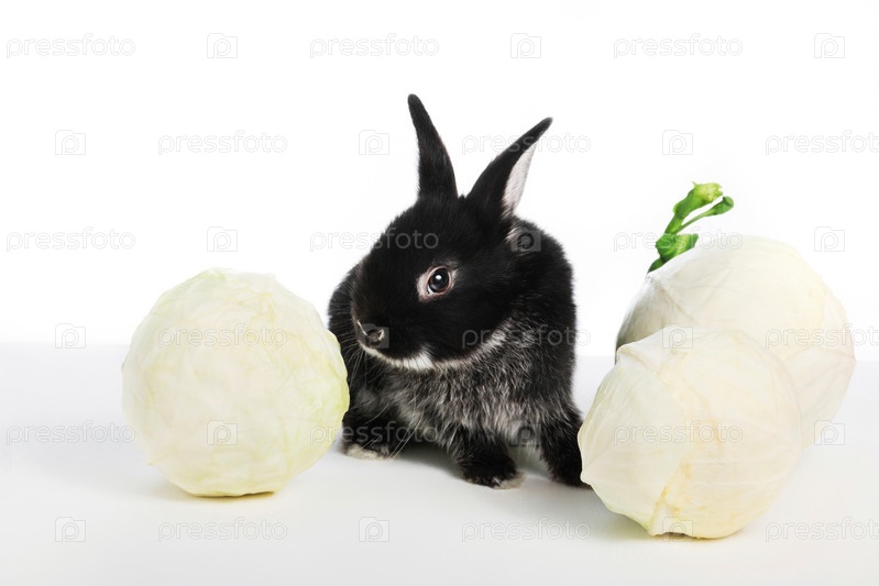 Маленький черный кролик нюхает капусту на белом изолированном фоне