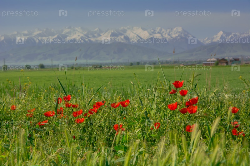 Цветущий красный мак на фоне белых горных вершин