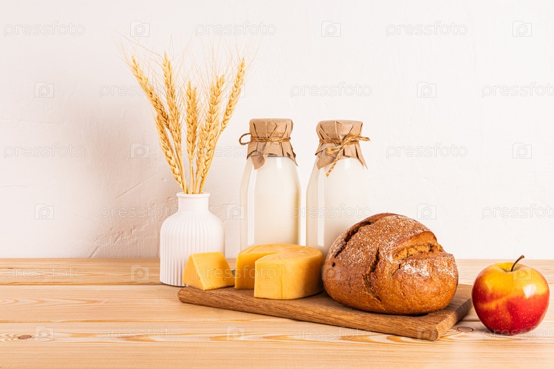 Разнообразие свежих молочных продуктов, хлеба, колосьев, яблок на деревянном столе. Угощения и символы еврейского праздника Шавуот