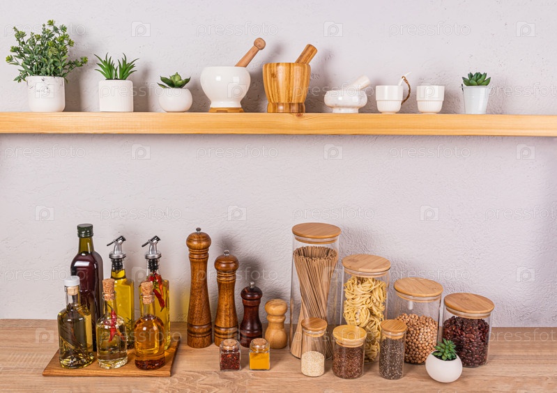 Стильный кухонный фон с набором бутылок с различными растительными маслами, стеклянными банками со специями. Вид спереди на открытую деревянную полку