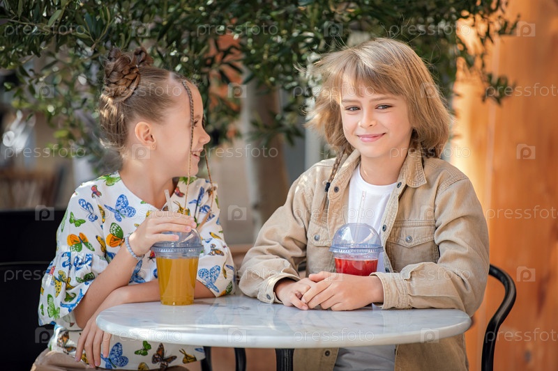 Дети и подростки весело вместе пьют фруктовый коктейль, сидя за столиком в летнем кафе