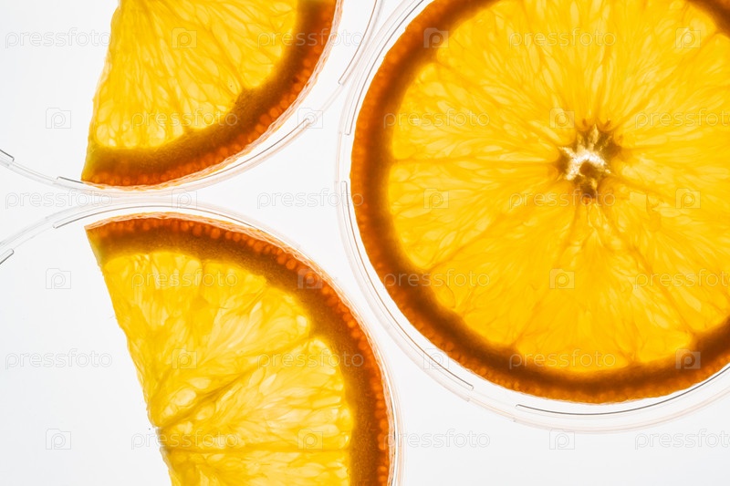 Макро прозрачных ломтиков апельсина с подсветкой, показывающих детали мякоти