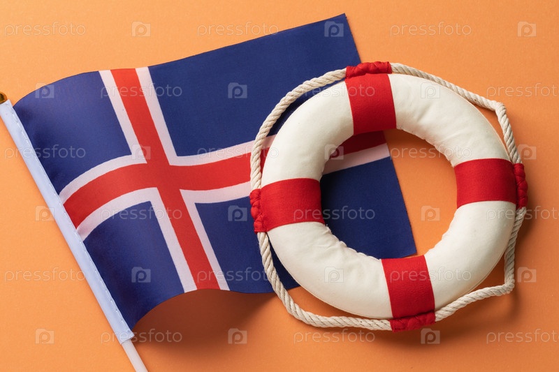 Флаг Исландии и спасательный круг на оранжевом фоне, концепция на тему помощи