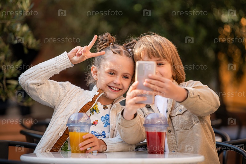 Дети-подростки счастливо болтают вместе, делают селфи и пьют фруктовый коктейль, сидя за столиком в летнем кафе