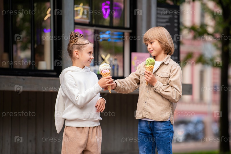 Дети-друзья весело едят мороженое вместе во время прогулки в парке