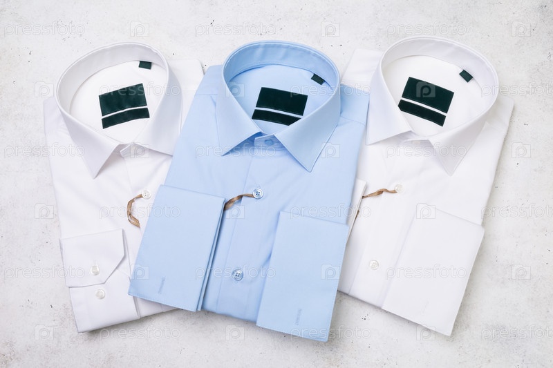 Три сложенные синие и белые классические мужские рубашки на абстрактном фоне, вид сверху