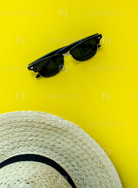 Флэтлей, летние каникулы. Соломенная шляпа с черной лентой и солнцезащитные очки на желтом фоне. Вертикальный фон