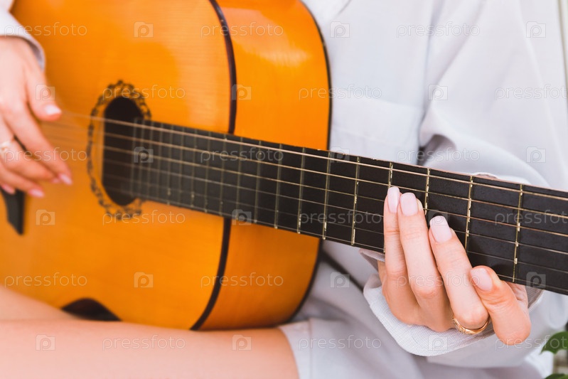 Женщина в белой рубашке играет на гитаре, крупный план