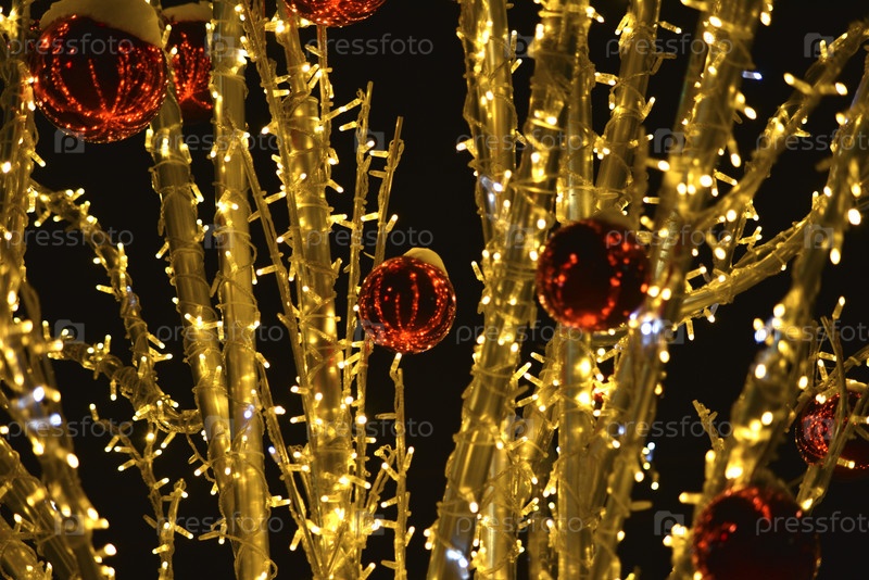 Красные шары зимней рождественской гирлянды. Зимние праздничные огни, огни елки