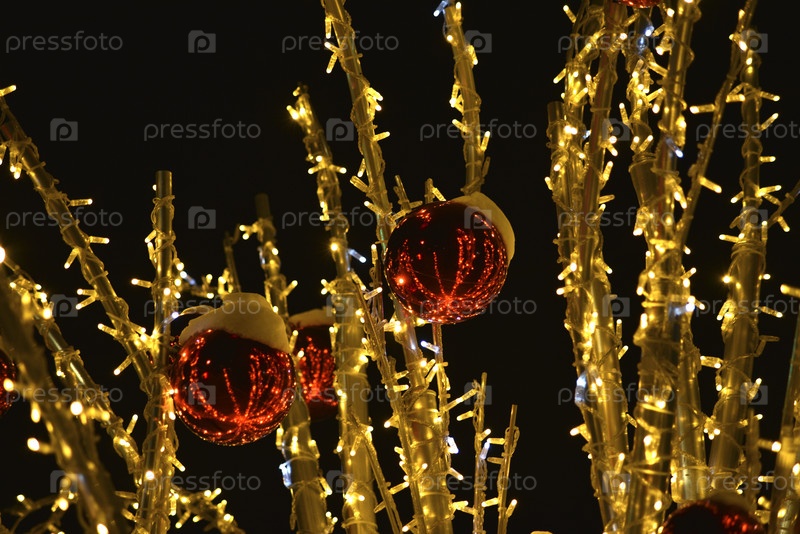Красные шары зимней рождественской гирлянды. Зимние праздничные огни, огни елки