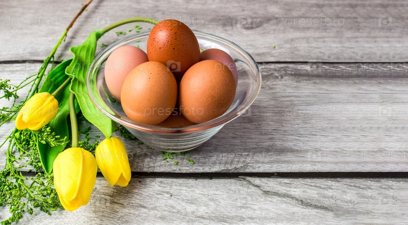 Коричневые яйца в стеклянной миске на деревянном фоне