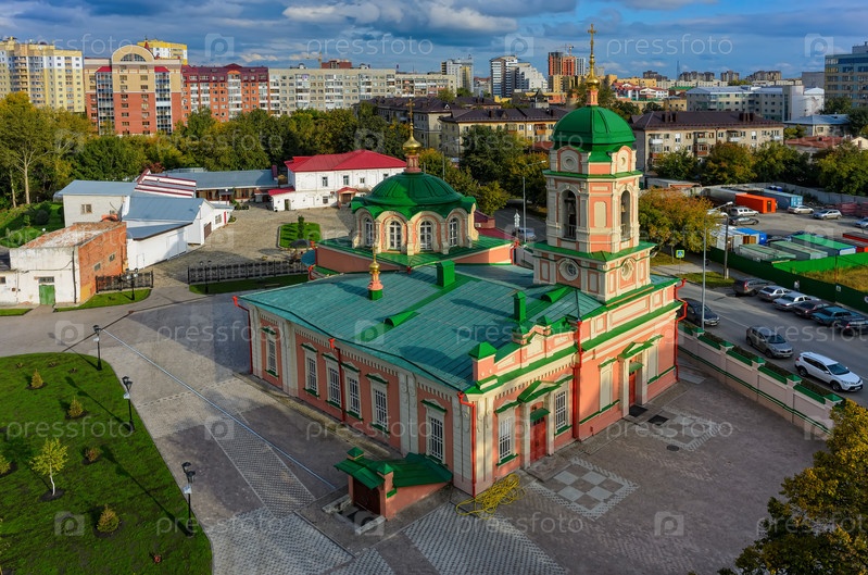 Тюмень, Россия - 3 сентября 2015 г.: Вид с воздуха на Ильинский храм Ильинского женского монастыря
