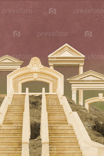 Сюрреалистический коллаж с элементами классической архитектуры. Художественный постер, концепция, обложка журнала. Античный городской пейзаж