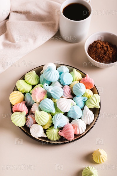 Сладкие маленькие безе на десерт на тарелке на столе, вертикальный вид