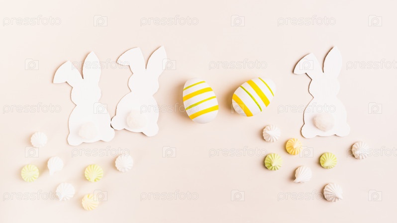 Белые декоративные кролики, пасхальные яйца и безе на розовом фоне, вид сверху веб-баннер