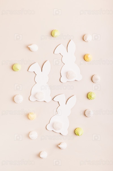 Счастливой Пасхи белые кролики, пасхальные яйца и мини-безе на розовом фоне сверху и вертикальный вид