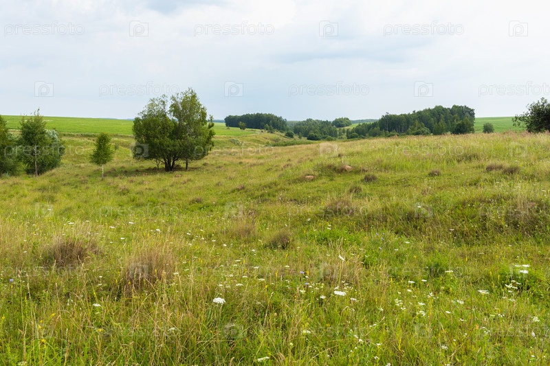 Сельский пейзаж на равнине с небольшими оврагами в пасмурную погоду