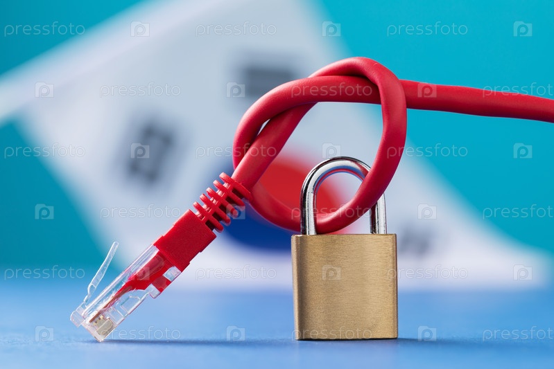 Закрытый замок на связанном сетевом проводе в узел на фоне флага Южной Кореи, концепция безопасности интернет-технологий в Южной Корее