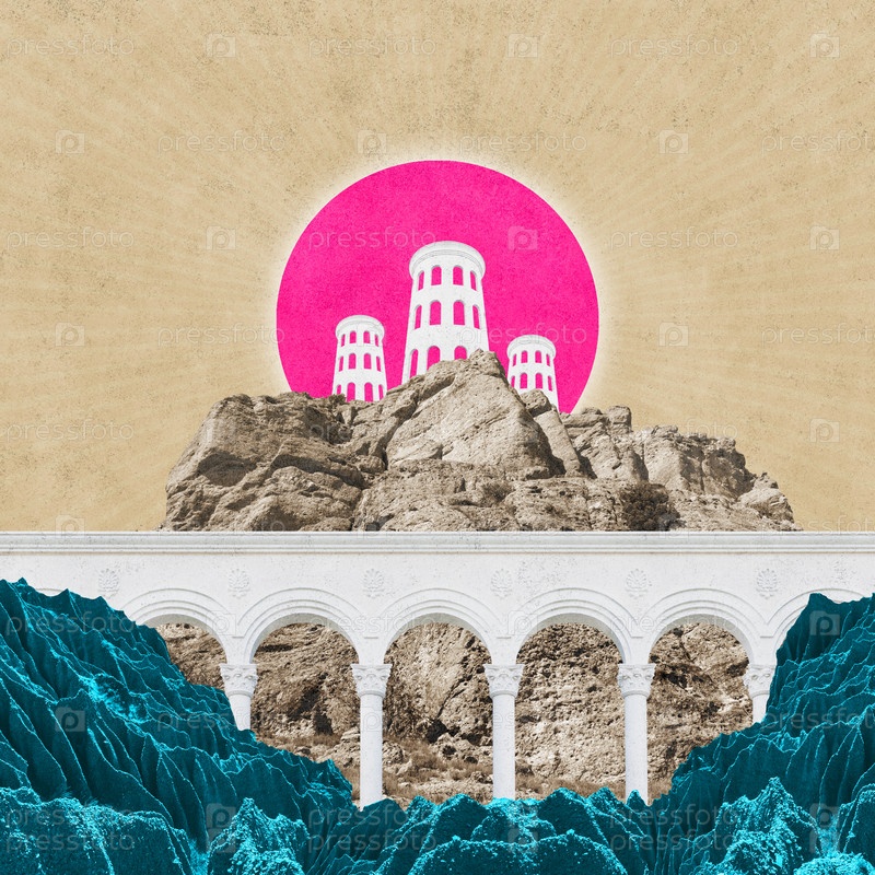 Сюрреалистический коллаж с элементами классической архитектуры. Художественный постер, концепция, обложка журнала. Античный городской пейзаж