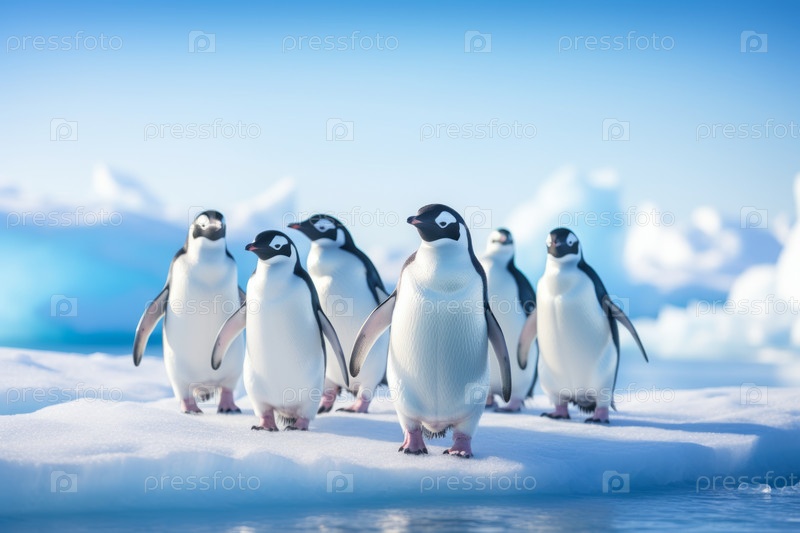 Группа пингвинов Генту находится на льду на фоне айсбергов