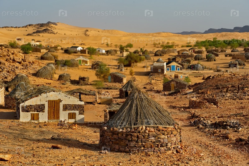 Западная Африка, Мавритания. Вид на поселок Куета с домами традиционной архитектуры, расположенный возле оазиса среди каменной пустыни на юго-западе Сахары