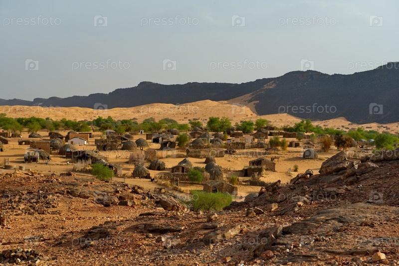 Западная Африка, Мавритания. Вид на поселок Куета с домами традиционной архитектуры, расположенный возле оазиса среди каменной пустыни на юго-западе Сахары