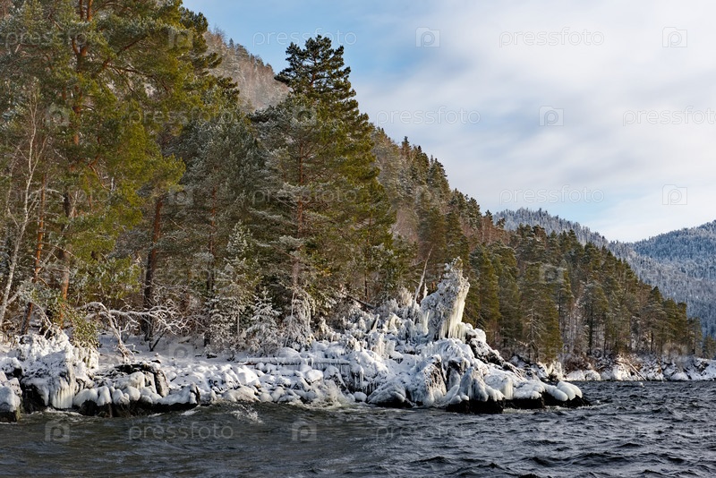 Россия, юг Западной Сибири, Горный Алтай. Вид на обледенелый берег телецкого озера в начале снежной зимы возле поселка Яйлю