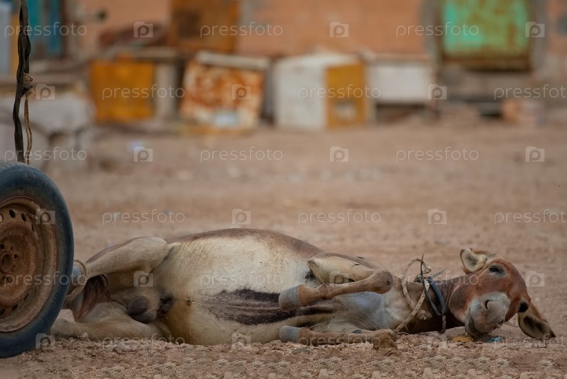 Западная Африка, Мавритания. Длинноухий осел отдыхает от тяжелой перевозки груза, купаясь в песке
