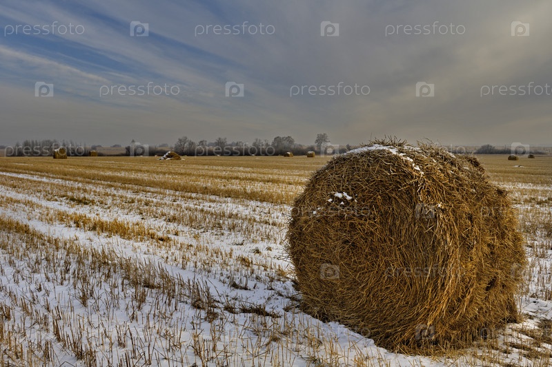 Россия. Юг Западной Сибири. Кузбасс. Свежие рулоны сена, оставленные фермерами на заснеженном поле морозным утром в начале зимы