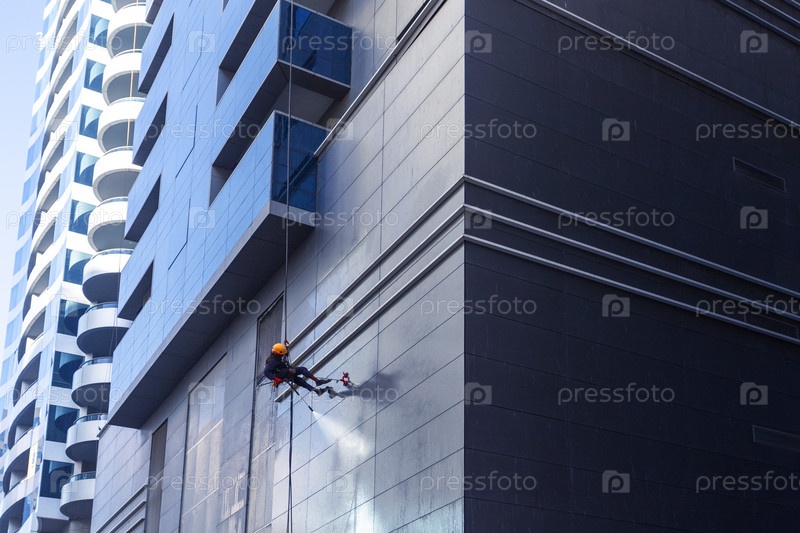 Профессиональный уборщик, чистящий фасад здания. Профессиональная клининговая служба