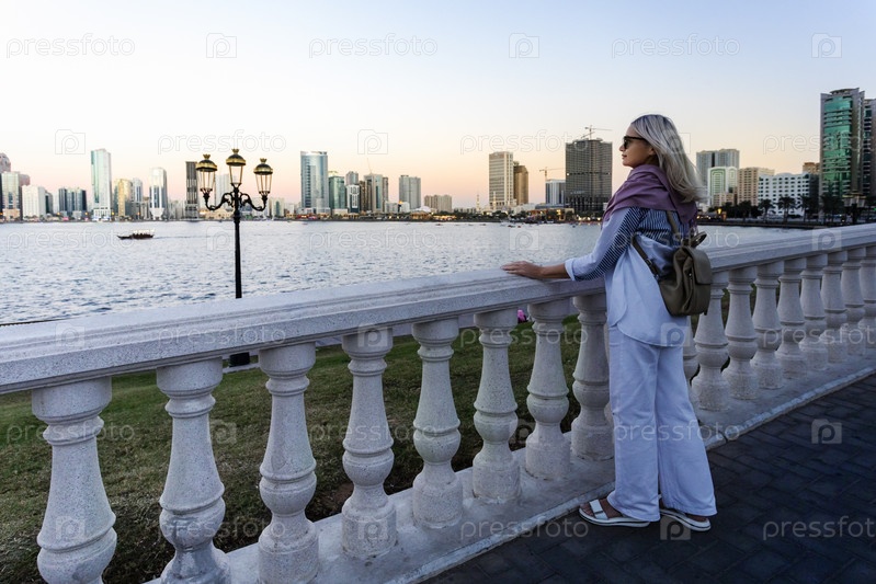 Счастливая женщина-туристка наслаждается красивым городским пейзажем на набережной летним вечером