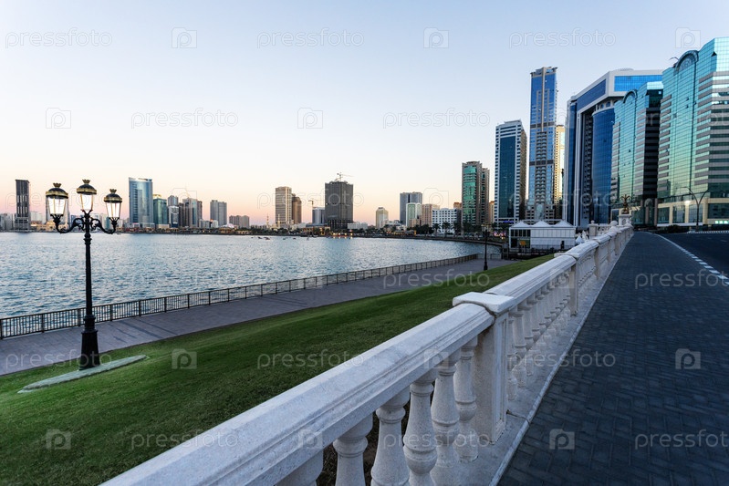 Прекрасный вид на набережную Шарджи на закате, ОАЭ. Путешествие на отдых в Объединенные Арабские Эмираты