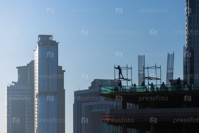 Строительство небоскреба. Строящееся здание с рабочими на рассвете