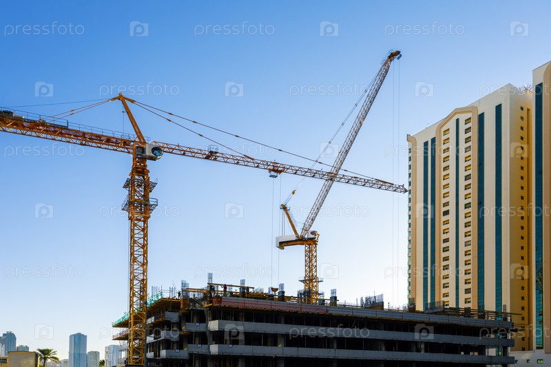 Строительство жилых домов. Строительная площадка с кранами