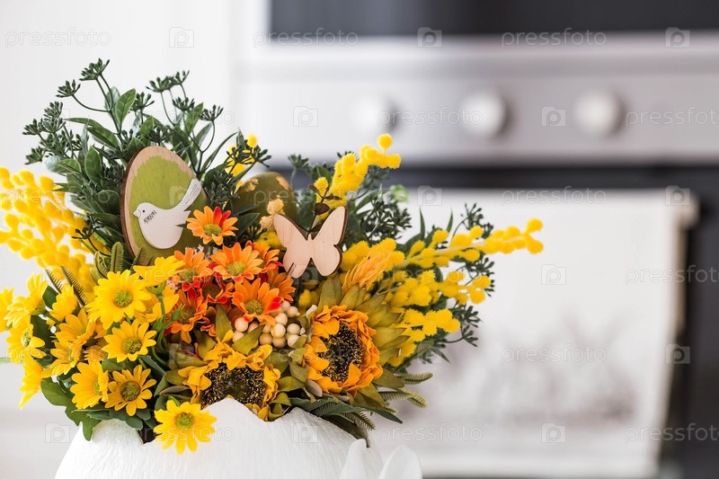 Весенний букет в яйце, пасхальные кролики и яйца с золотым узором на столе. На заднем плане — белая кухня в скандинавском стиле. Красивая поздравительная открытка. Пасхальный декор в доме