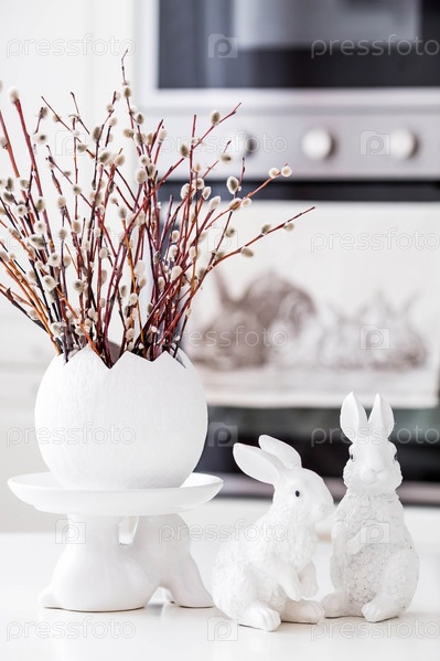 Букет из веточек вербы к православному празднику Вербного воскресенья. Верба в белом яйце и пасхальные кролики в интерьере современной белой кухни