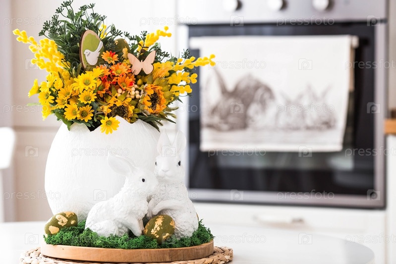 Весенний букет в яйце, пасхальные кролики и яйца с золотым узором на столе. На заднем плане — белая кухня в скандинавском стиле. Красивая поздравительная открытка. Пасхальный декор в доме