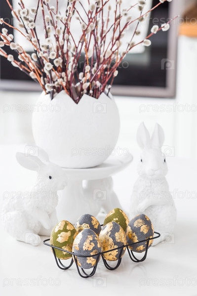 Букет из веточек вербы к православному празднику Вербного воскресенья. Верба в белом яйце, пасхальные кролики и пасхальные яйца в интерьере современной белой кухни